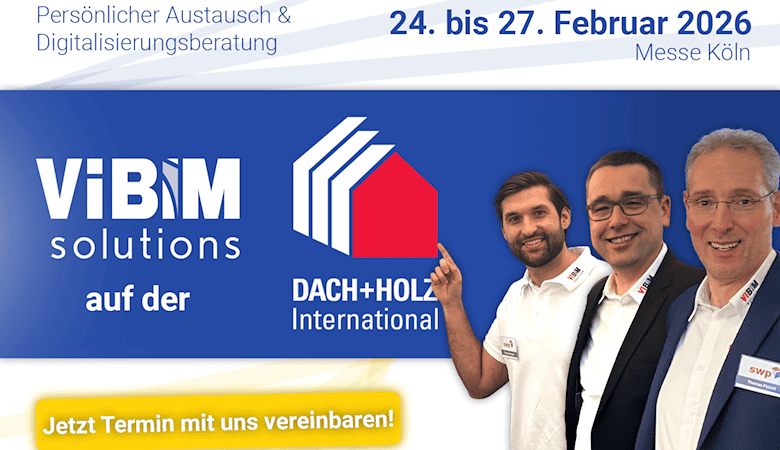 Sichern Sie sich jetzt Ihren persönlichen Termin auf der DACH+HOLZ International in Köln! Nutzen Sie die Gelegenheit, unsere neuesten Lösungen kennenzulernen, Ihre Fragen direkt mit unseren Experten zu besprechen und individuelle Einblicke in Version 27 von Vi BIM solutions zu erhalten. Wir freuen uns auf Sie!