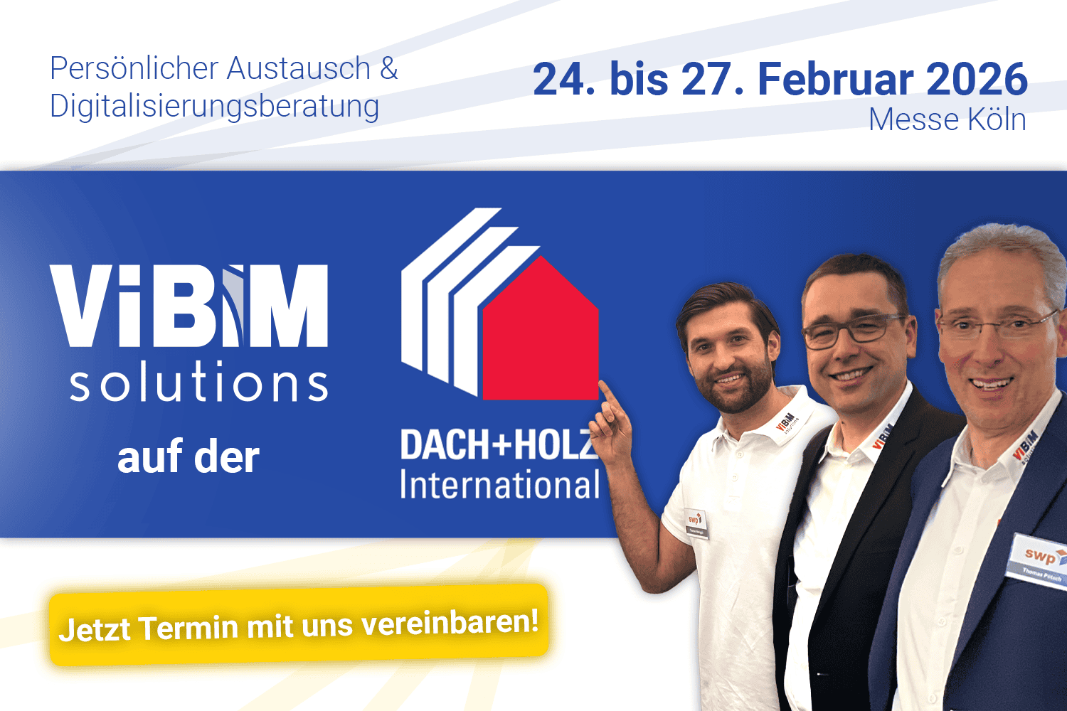 Sichern Sie sich jetzt Ihren persönlichen Termin auf der DACH+HOLZ International in Köln! Nutzen Sie die Gelegenheit, unsere neuesten Lösungen kennenzulernen, Ihre Fragen direkt mit unseren Experten zu besprechen und individuelle Einblicke in Version 27 von Vi BIM solutions zu erhalten. Wir freuen uns auf Sie!