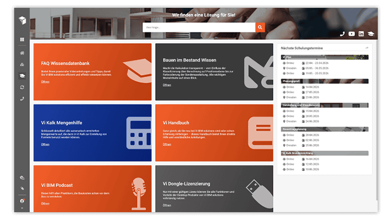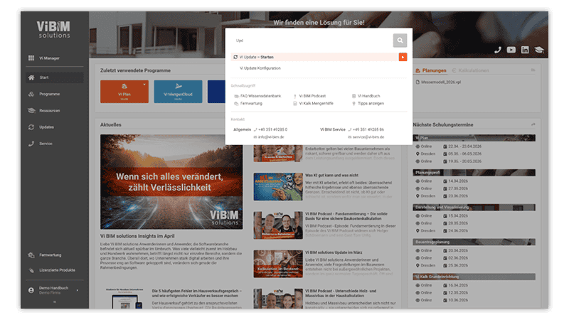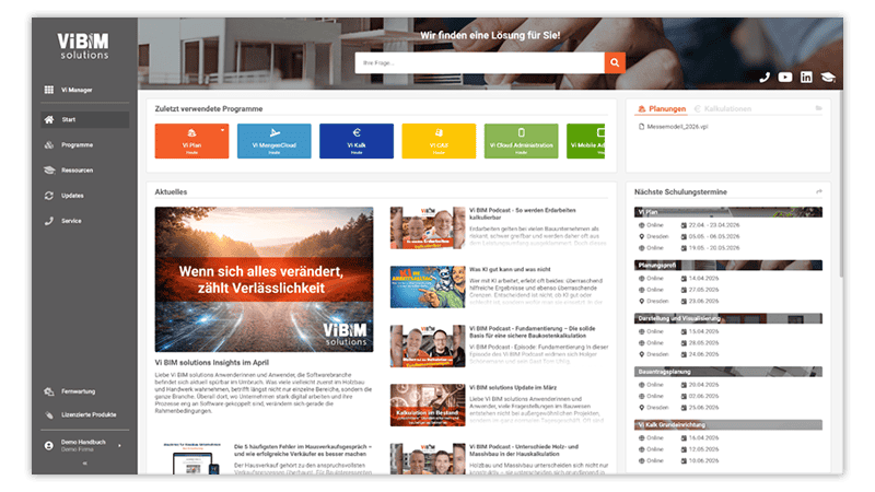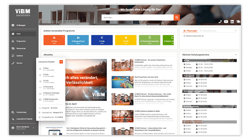 Mit dem neuen Vi Manager 4.0, der gemeinsam mit der Vi BIM Version 27.5 veröffentlicht wird, erhält die Startseite ein umfassendes Update. Ziel ist es, die Bedienbarkeit weiter zu verbessern, wichtige Funktionen zentral bereitzustellen und den Zugriff auf Programme, Informationen und Services noch einfacher zu machen.