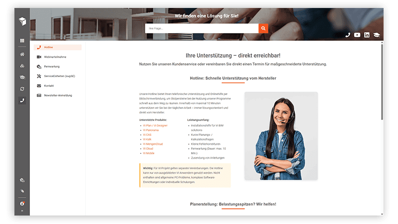 Die SERVICE-Seite bleibt im Vi Manager 4.0 in ihrer bewährten Form erhalten und bietet weiterhin Zugriff auf alle bekannten Service-Funktionen und Unterstützungsangebote.
